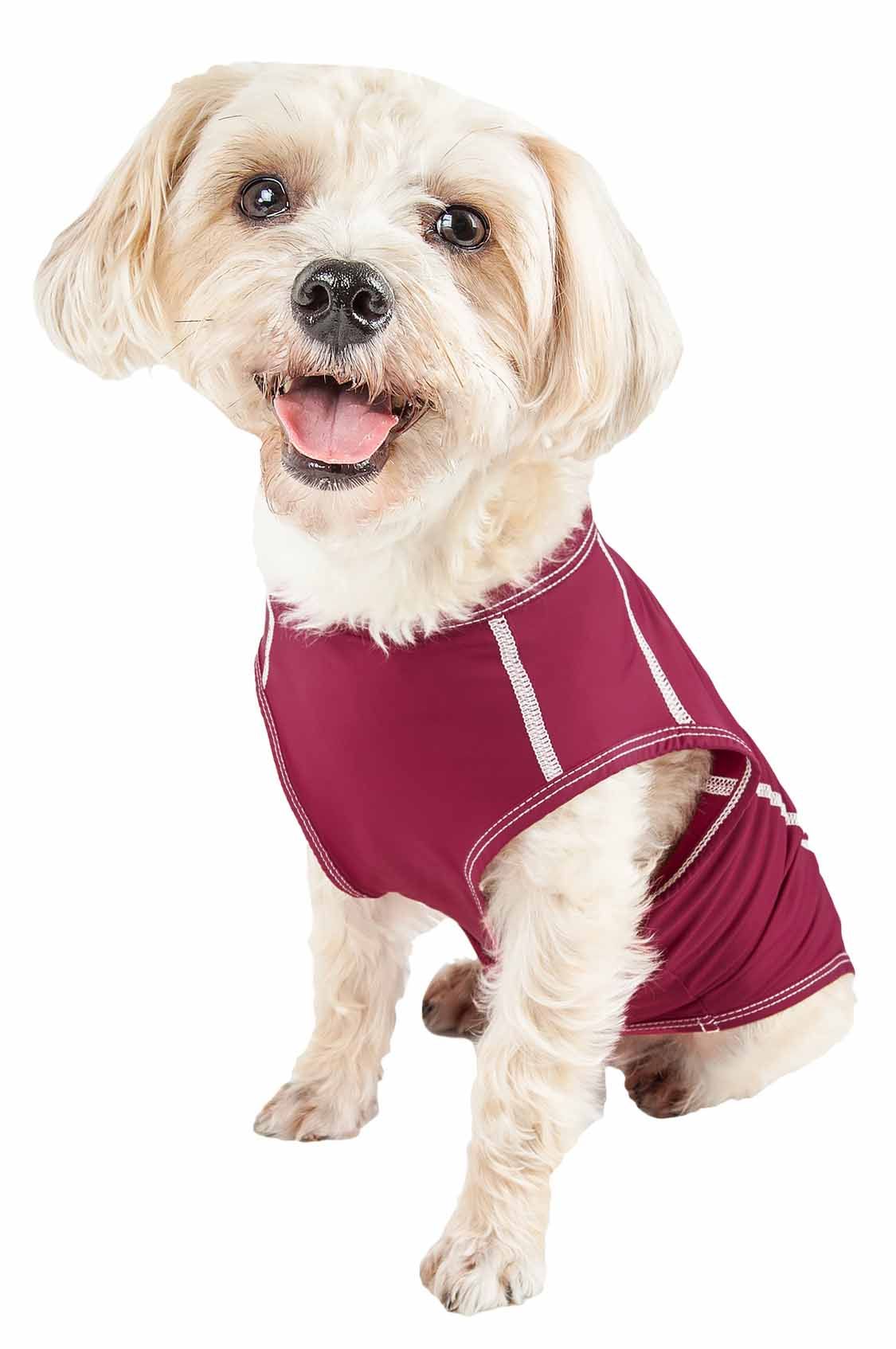 The Pet Life ACTIVE 'Racerbark' Solid Dog Tank Top is comprised of a Lightweight and Stretchy Yoga-like Performance fabric that maximizes Mobility and Comfort. Features 4-Way Stretch Construction that moves better in every direction with a customized fit that's further than next to skin or Fur without the squeeze and won't bunch up. This specially formulated stretchy Micro-Fiber features a higher-grade of Elasticity that won't ever lose it's shape and is Permeable which provides Breathability. This Smooth-to-the-touch fabric features Quick-Drying properties that repels body moisture or sweat and features Anti-Odor technology that assists with odor causing microbes. The Racerbark is also UV Protectant against the suns harmful rays and strategically fitted to help assist in containment of shedded hairs. Design features Dual Reinforned stitching at every seam for added durability with a Pull-Over design for easy on and off access and Reflective-Taping for added night visibility. Machine Washable. This style is part of our Pet Life Activewear Collection. Available in Multiple Sizes and Colors.